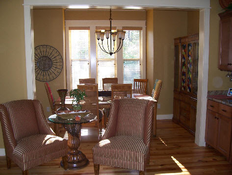 Below: The living room, which is open to the dining area. There is also an opening to the kitchen, with a bar seating area.