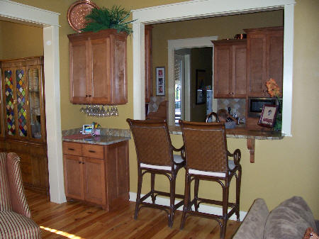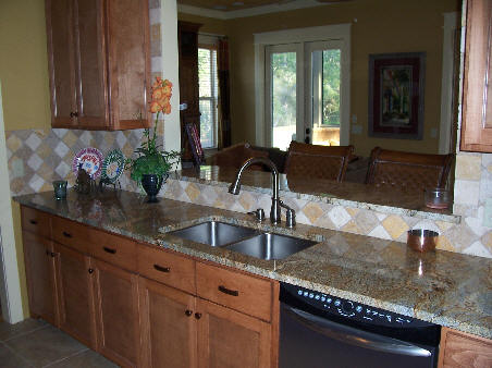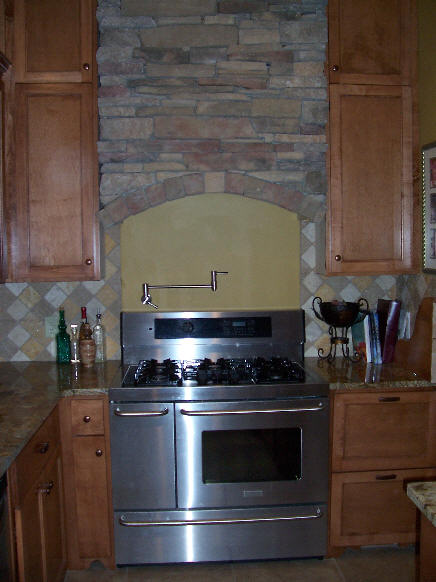 Below: The kitchen, with custom cultured stone work above the stove. The kitchen has an opening to the living/dining area with a bar seating area, which you can see in the photos below.