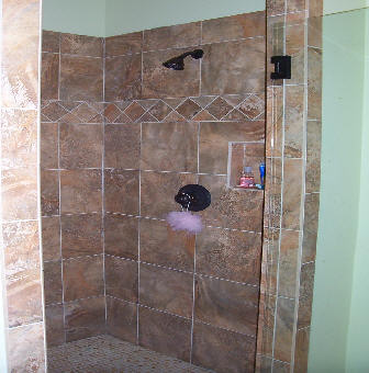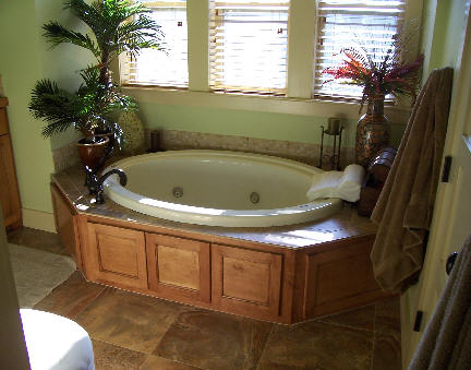 Below: The master bathroom, with custom stone tilework in the shower and a jet tub